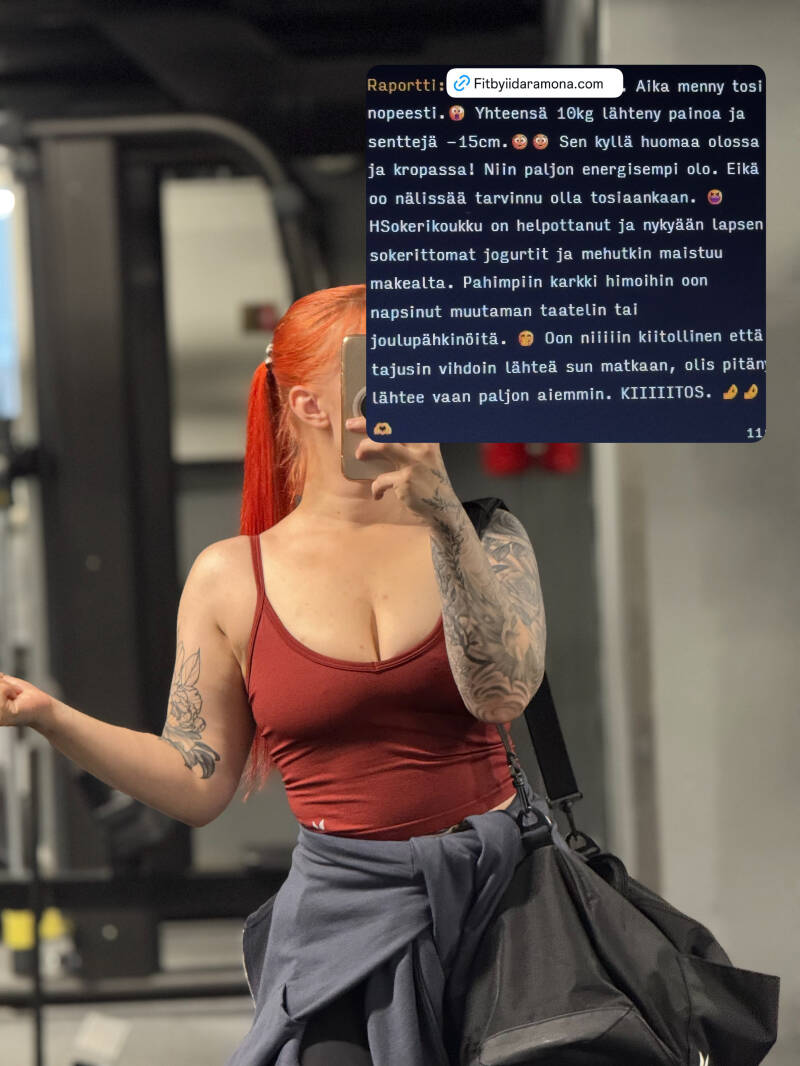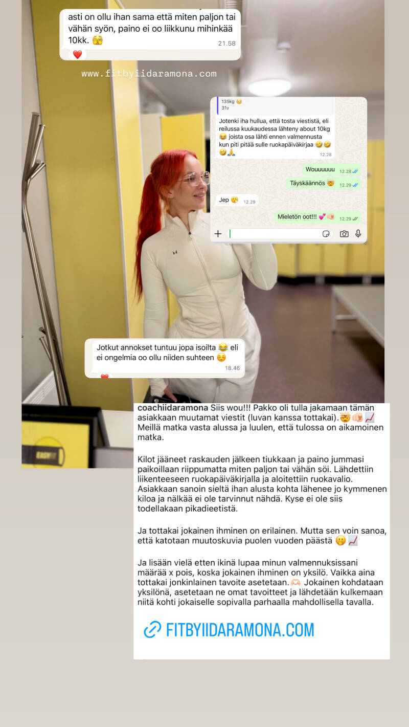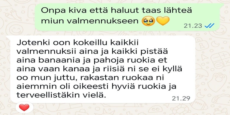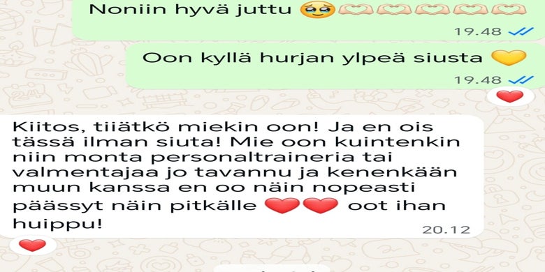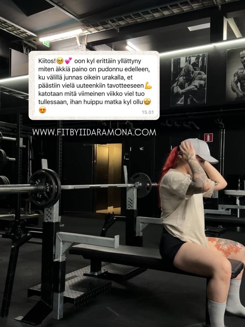 "Valmennuksessa on ollu niin helppo pysyä kun valmentaja on niin kannustava ja kehuva. Pienistäkin asioista kehuu ja siitä tulee tosi hyvä mieli. Muutoksia ruokavalioon sekä treeni ohjelmaan on saanut jos siltä on tuntunut."